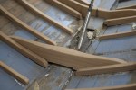 Wie ich feststellen musste, war der Kielbalken vor allem im vorderen Bereich komplett verrottet. Ihn auszubauen und zu ersetzen würde aber die Formstabilität stark beeinflussen. Ich hatte nun die Schale mit den neuen Spanten gut stabilisiert. Doch die Verbindung im Kielbereich war nun das Problem. Ich musste zuerst die Verbindung zwischen den Planken der beiden Seiten sichern. So begann ich zuerst, die Bodenwrangen zu ersetzten. Vermutlich unüblich verleimte ich Sipo Mahagonileisten zu einem Balken und hobelte dann das Profil der Bodenwrangen aus dem Balken. Ich passte die Wrangen in den bestehenden Kielbalken ein, wissend, dass das bei dessen Ersatz vermutlich nochmals zu Korrekturen führen wird. Ein Vorteil, dass ich den Kiel noch nicht entfernt hatte zeigte sich nun, indem ich die Bodenwrangen bereits auch verbohren und auf die Kielbolzen einpassen konnte. Jede Wrange ist natürlich ein Einzelstück. Es machte aber immer wieder sehr viel Freude, wenn eine fertig eingebaut war.