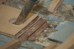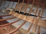 Nachdem die Spannten und Bodenwrangen ersetzt oder ausgebessert sind, wagte ich mich an den Ersatz des Kielbalkens. Zuerst baute ich segmentweise die Innenseite aus. Da der Kielbalken gerundet ist, laminierte ich auf den alten Aussenteil, getrennt, mehrere 5 mm Mahagoni Schichten auf. Für die Stösse liess ich die Überlappung offen. Natürlich passten danach die Bodenwrangen nicht mehr und mussten neu eingepasst werden. Noch immer stand das Boot auf dem Kiel. Ich musste also aufpassen, dass jedes Segment wieder tragend war, bevor ich ein weiteres Segment ausbaute. Insgesamt ging das aber sehr gut und dank der Laminierung erhielt ich so eine recht hohe Steifigkeit des inneren Kielbalkens. Zudem konnte ich auch den Anschluss an die Planken abrichten, damit ich dann, wenn das Boot vom Kiel genommen und umgedreht ist, ich die Planken gut einpassen und von aussen dann den Kielbalken weiter aufsetzen kann.