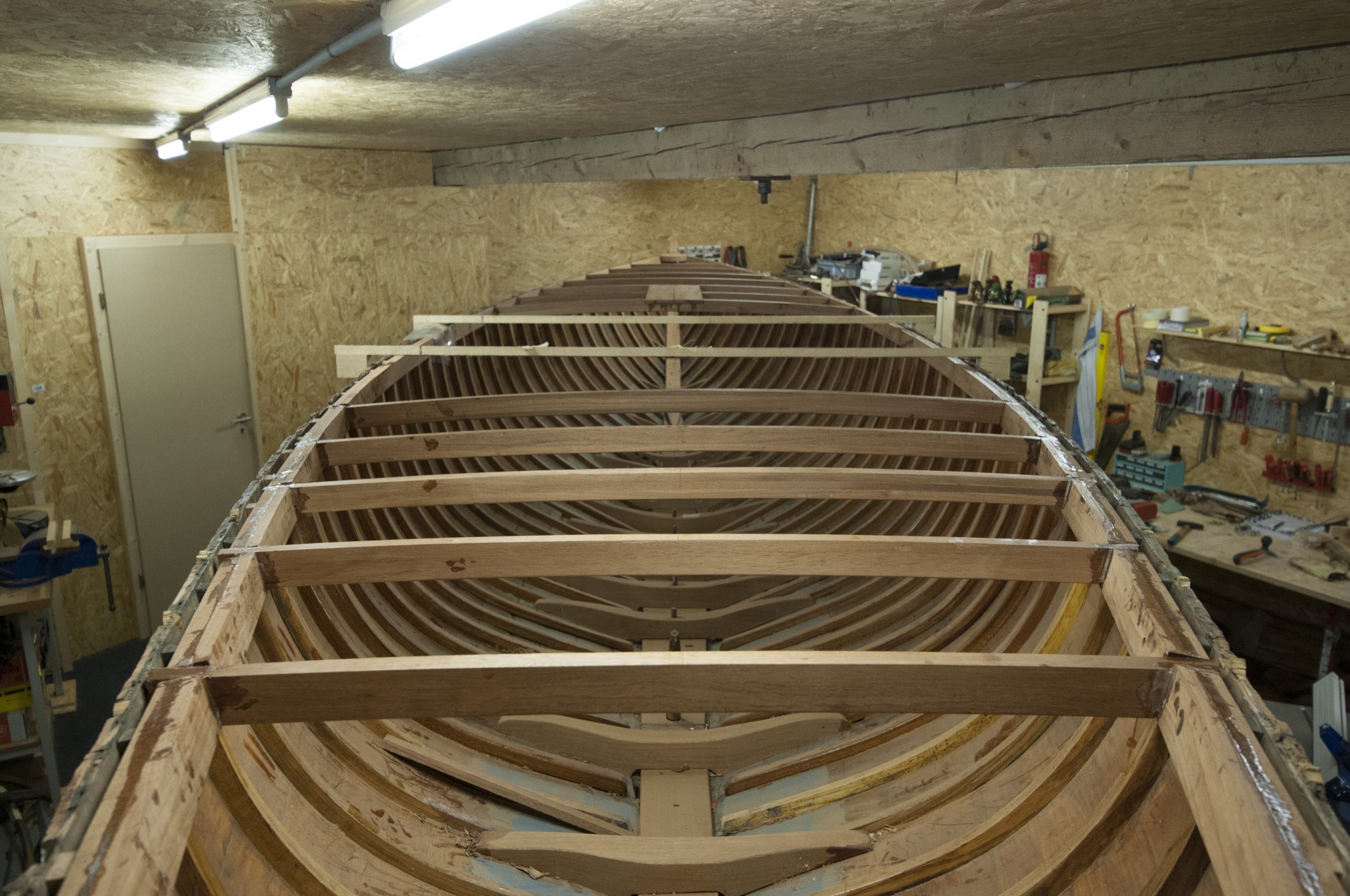 Die Balkweger tragen zur Versteifung der Schale im Deckbereich bei und tragen die Decksbalken. Wie im Original bauten auch wir wieder die Balkweger auf die Innenseite der Spanten ein. Wir verwendeten dazu Mahagoni Leisten und überleimten 2 Lagen. Im Bug legten wir eine Verstärkung ein, welche die Beschläge für das Vorstag und anderes aufnehmen soll. Danach laminierten wir die Decksbalken mit der gleichen Wölbung wie die Originale. Anschließend legten wir die Decksbalken in die Balkweger ein und verleimten sie mit Epoxy. Die Balkweger waren höher als die Decksbalken, damit wir sie dann auf die Deckhöhe abhobeln konnten.