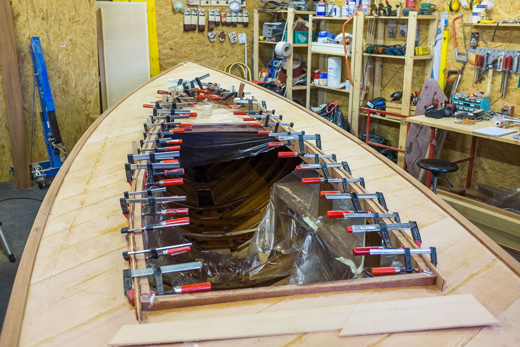 Die Süllbreite ist so ausgelegt, dass auch Klemmen darauf montiert werden können. Nun steht noch das Schliefen und das Abrunden der Innenseiten an, so dass man dann doch bequem auf dem Seitendeck sitzen kann.