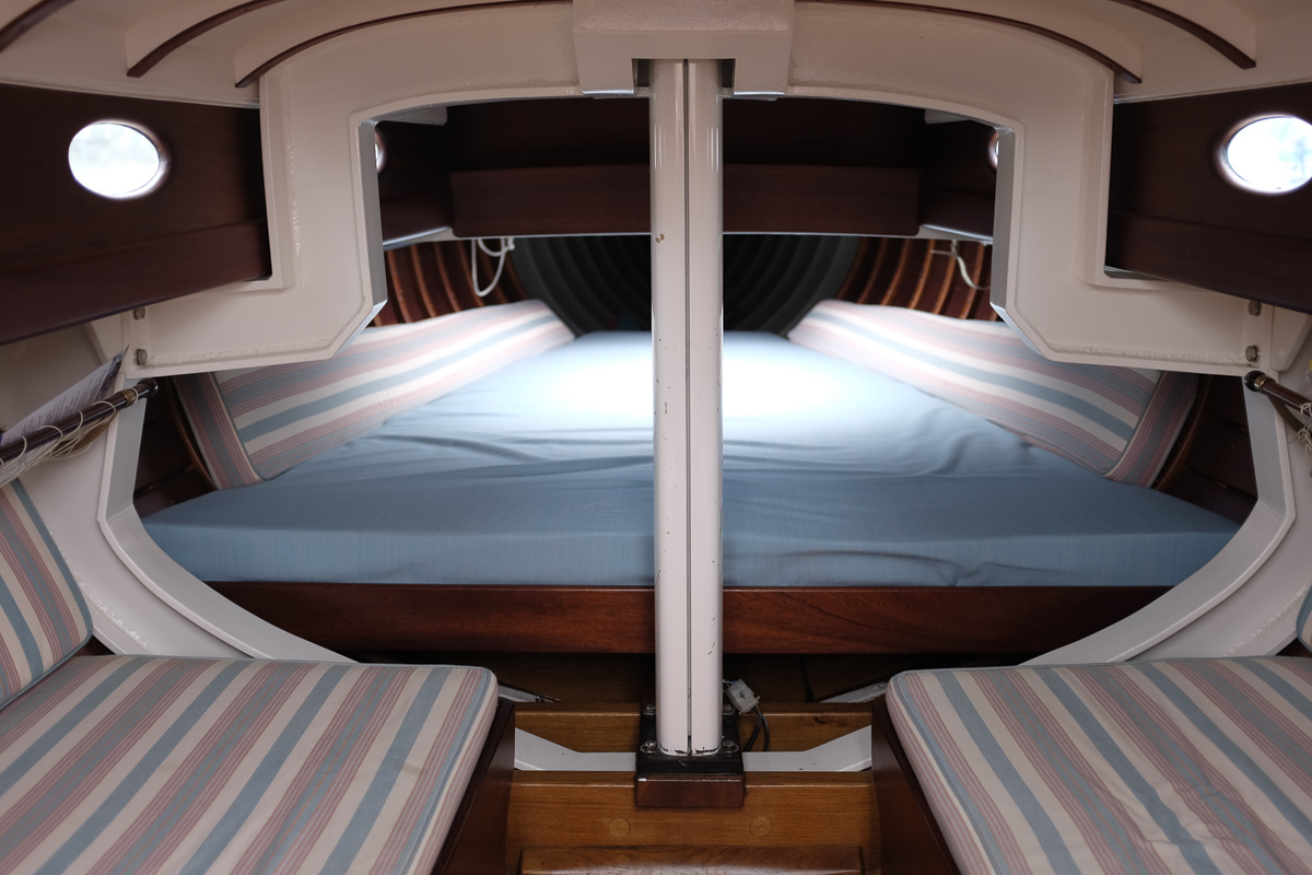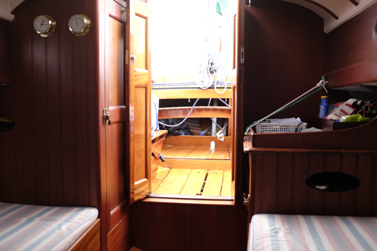 Kürzlich habe ich neue Polster für das Vorschiff machen lassen. 14mm dick mit einem eingelegten Lattenrost. Herrlich, wie man da schlafen kann. Überhaupt ist die Optik im Bootsinneren sehr beruhigend und wohnlich, obwohl natürlich keine Stehhöhe verfügbar ist. Das Vorschiff bietet 2 Personen einen komfortablen Schlaf und das Mittschiff eine gute Sitzgelegenheit im Trockenen. Dazu kommen ein Kleiderschrank und eine „Pantry“, sprich ein Spirtituskocher mit Geschirr und allem was es braucht, um mal Spagetti oder ein ausgedehntes Frühstück zu machen. Essen sollte man dann allerdings im Cockpit, wo ein geräumiger Tisch installiert werden kann.